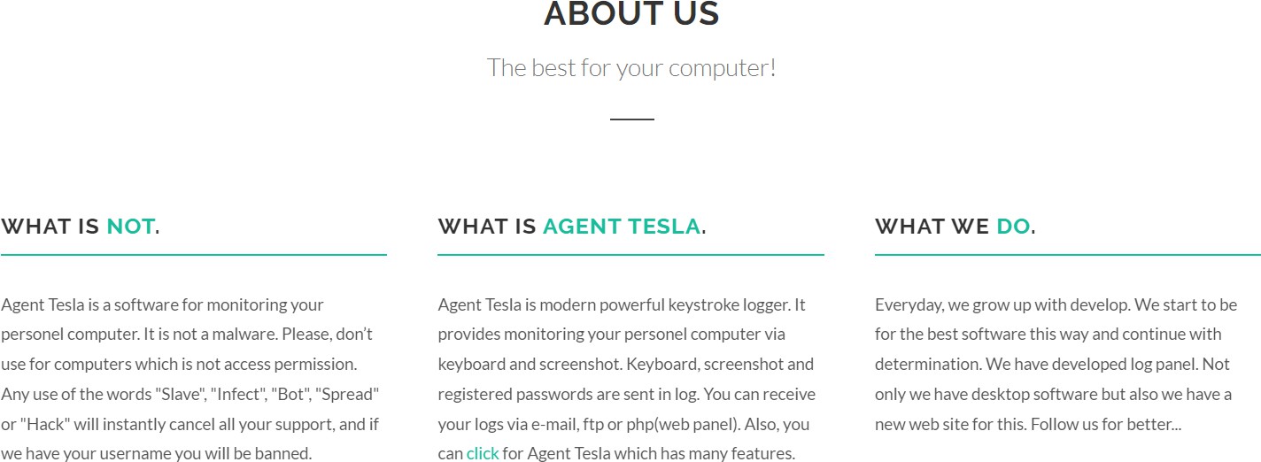 Agent Tesla is a spyware that is capable of stealing personal data from web browsers, mail clients and FTP servers. It can also collect screenshots, videos and capture clipboard data. Recent versions of this malware are also capable of stealing personal data from VPN clients. It was being sold on the underground markets for as low as $12 up to $70 depending on the additional features.