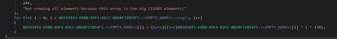 The malware strings are obfuscated which makes reversing more difficult. The encrypted strings are stored in a big array. This array is decrypted using the XOR algorithm with the key “170”.