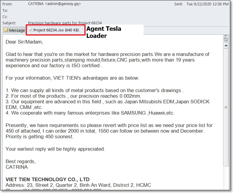 Campaigns usually start with a phishing email with a malicious attachment. Based on the samples we found in September 2020, these campaigns target multiple industries related to shipping, supply chain and banks. In some cases, the attachments are archives, such as .iso, .rar or .uue like below: