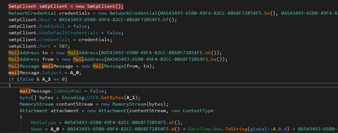 Code inside AgentTesla to exfiltrate stolen information using e-Mail