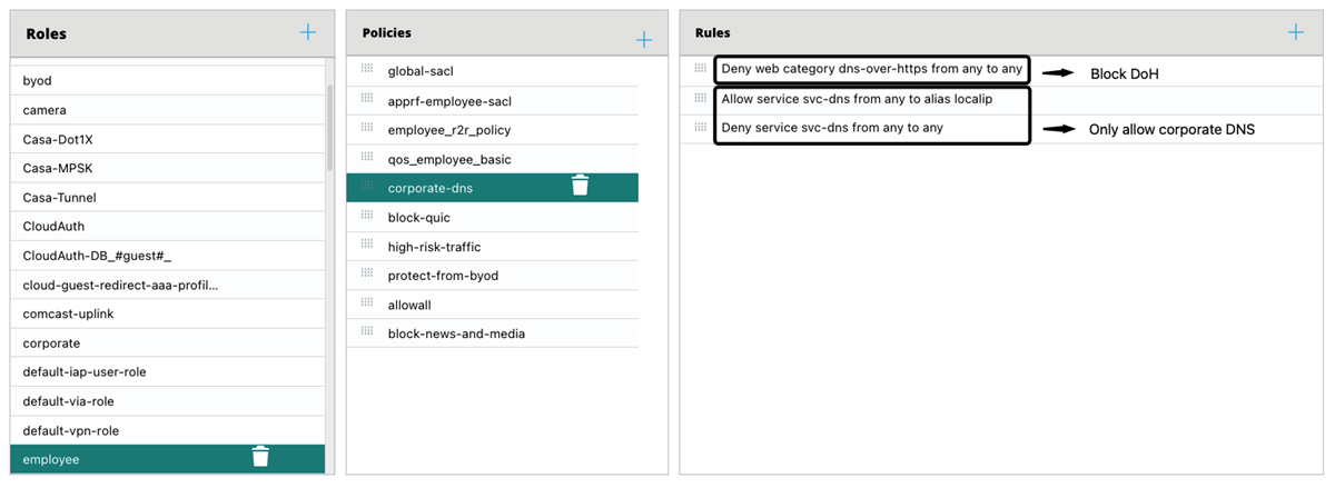 Enforcing DNS traffic through your corporate servers restores your ability to classify traffic based on domain and apply category-based rules. Blocking DoH in HPE Aruba Networking APs and GWs is as simple as blocking access to the "dns-over-https" web category. Here's an example of a policy that would do this: