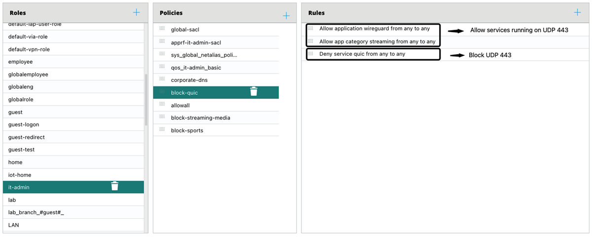 Blocking QUIC forces clients to use TLS over TCP, where SNI (Server Name Indication) remains visible and can be inspected for domain classification even without full decryption. To do so in HPE Aruba Networking APs and GWs, create a policy that only allows the use of UDP 443 for corporate-sanctioned applications. Streaming applications (which benefit from the accelerated negotiation when using QUIC) or the wireguard tunnels often created by ZTNA agents (such as the atmos agent) are a good example of a legitimate use for UDP 443. A good example would be the following policy, where "streaming" and "wireguard" are allowed, but unknown traffic using UDP 443 is blocked.