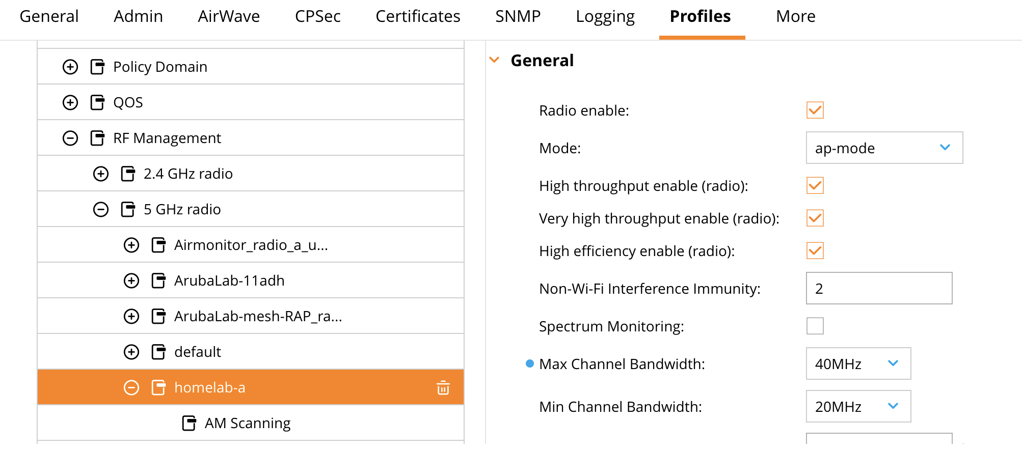 You probably have a controller deployment. In that case create an RF Management profile (first enable Advanced Profiles under your User Profile), and assign that to the AP Group: