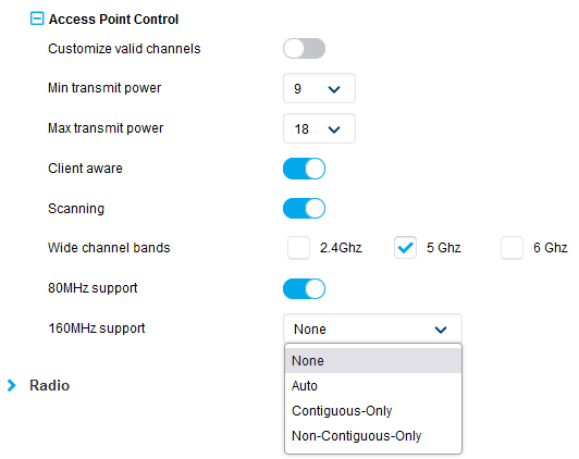 But I was able to find the 2.4 GHz and 5 GHz channels selection under AP Groups > Radio > Basic. I changed the channels for 5GHz and removed all 40 MHz , 80 MHz and 160 MHz channels and only kept 20 MHz channels. However I still see clients connected on 40 MHz and 80 MHz. Not sure if I am missing something.