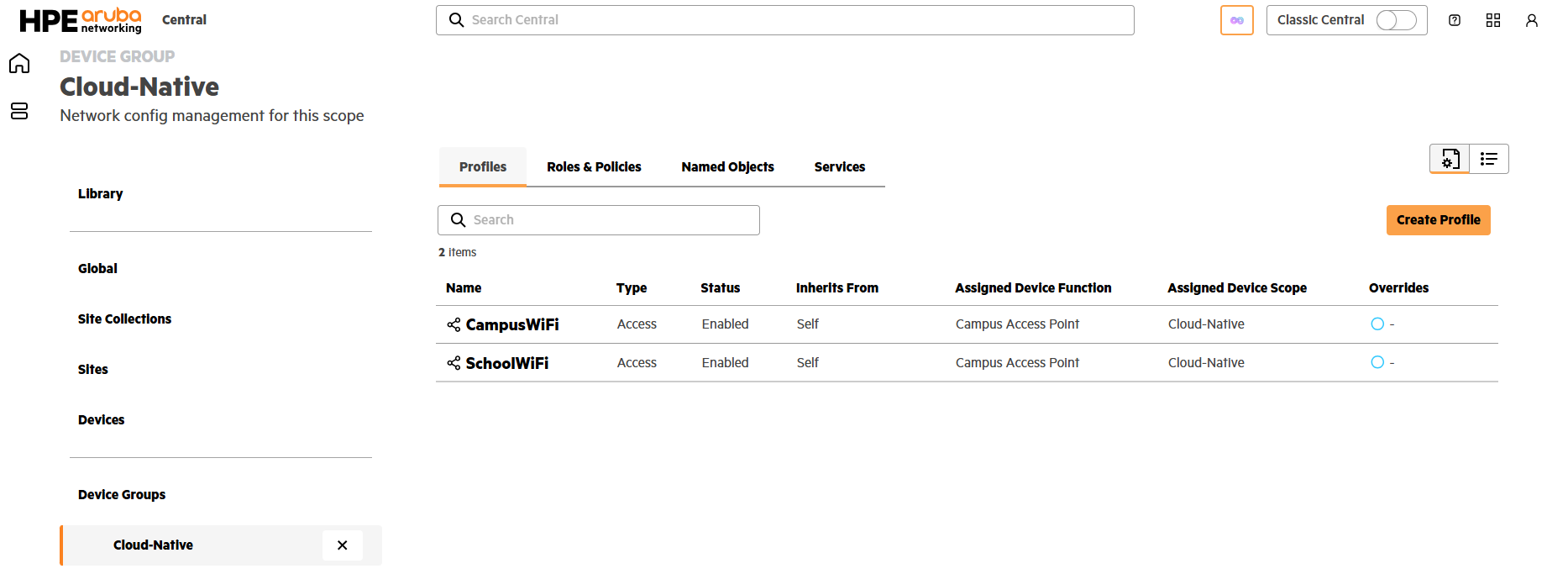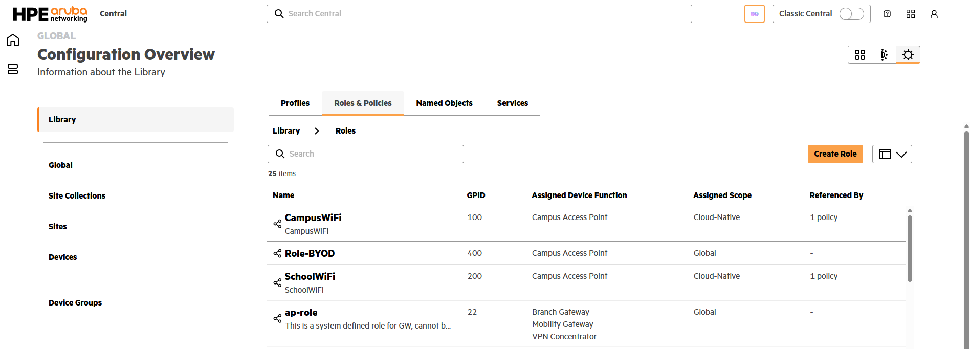 Yes sir... Everything was done through New Central... I followed along with this Aruba lab guide. The only thing that differed was the roles themselves. The guide mentions using some pre-built lab roles that obviously didn't exist in my system, so I created one at the Library level and then assigned it to "Campus Access Point" with a Global scope: