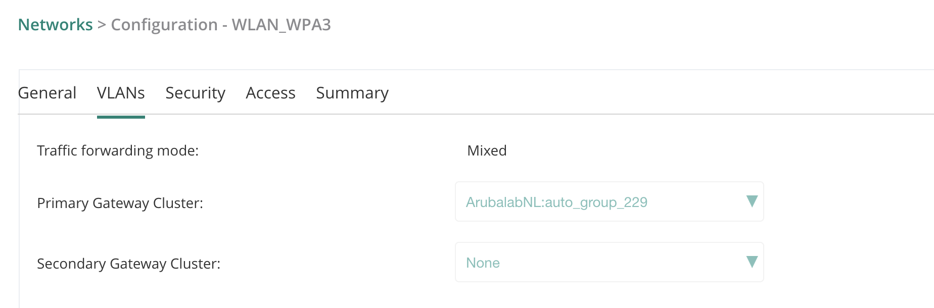 In AOS10, you configure per WLAN/SSID a cluster and optionally a secondary cluster in case the primary cluster is not available: