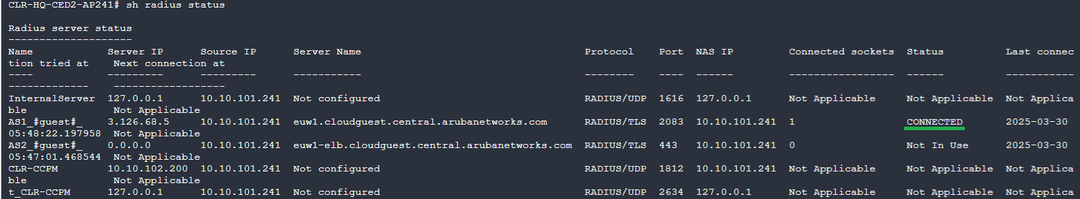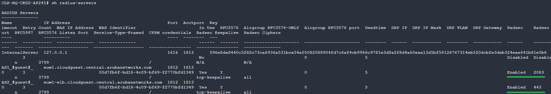 "show radius-servers", make sure that the Cloud Guest servers are showing RadSec enabled and port 2083 or 443.