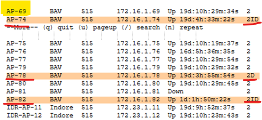 After the upgrade, the controller now supports 36 APs, but the remaining APs (total of 52 in production) are showing D and ID flags.