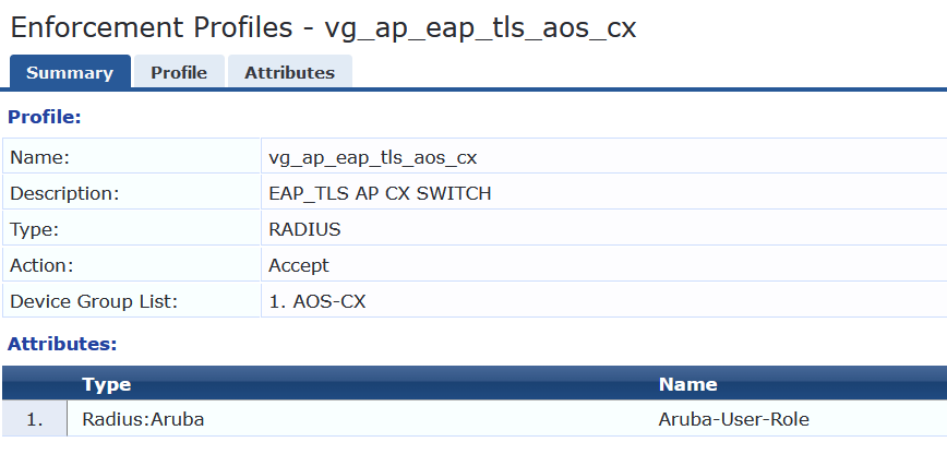 We are using ClearPass to send down a user-role to our Aruba CX switch. We are using local user roles in this environment. I am successfully applying the local user roles on our Aruba AOS switches but am having difficulty with our CX switches. this is on one of our lab switches as we are still in the beginning stages of trying to get wired security to work.