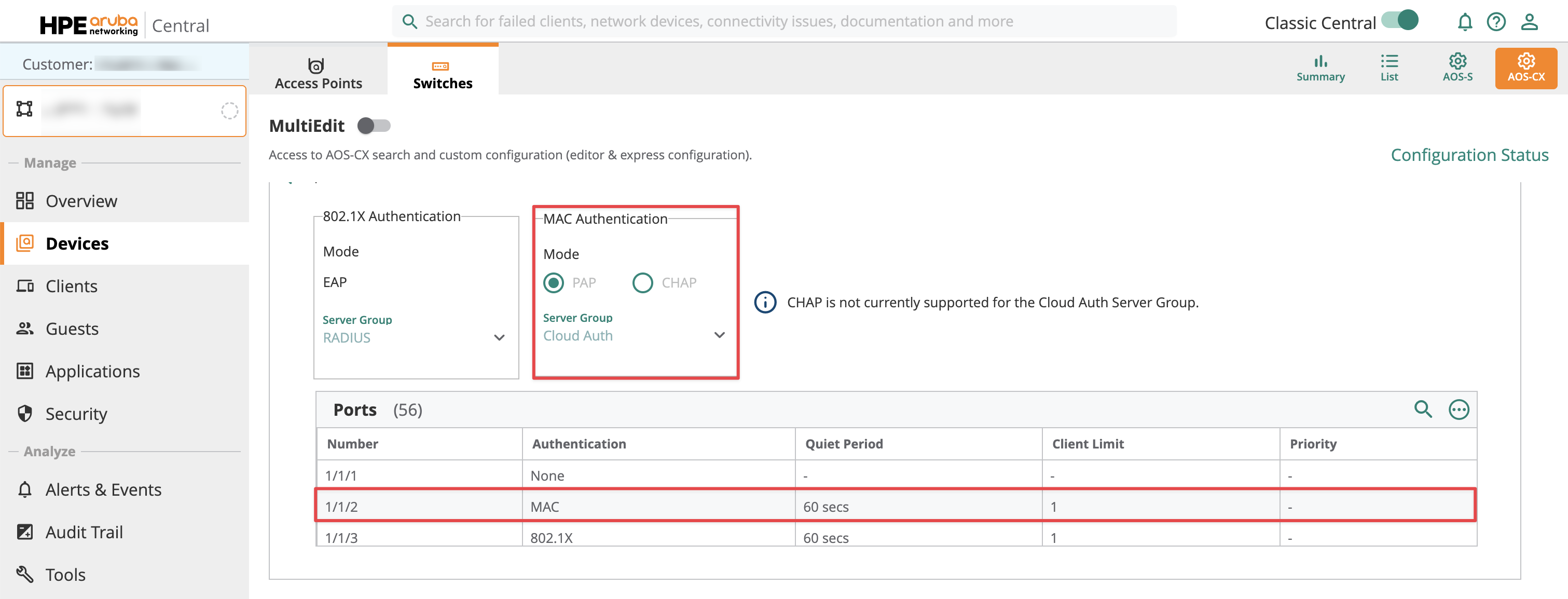 Aruba CXスイッチにてMACアドレス認証を設定するための手順についてご教示いただきたいです。