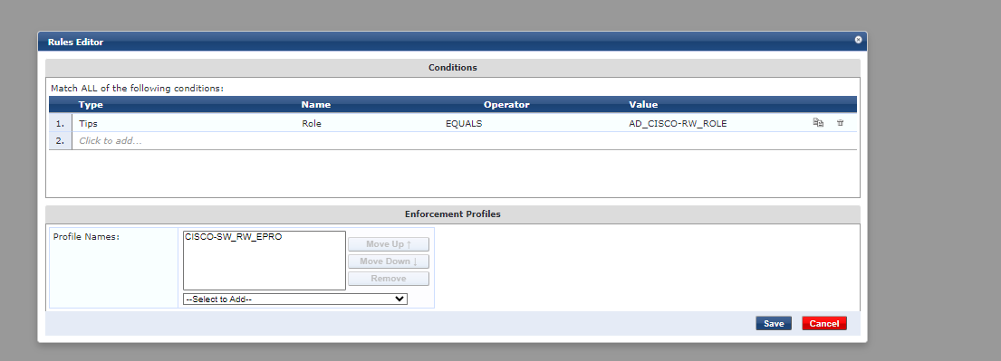 This would return the CISCO-SW-RW_EPRO enforcement profile if the AD_CISCO-RW_ROLE is present in the authentication.