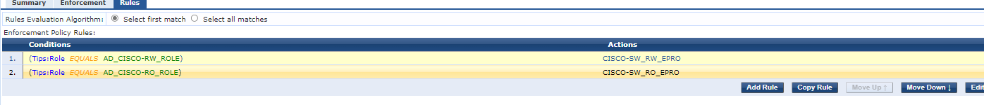 If that is not the case, it would return the CISCO-SW-RO_EPRO enforcement profile if the AD_CISCO-RO_ROLE is present in the authentication.