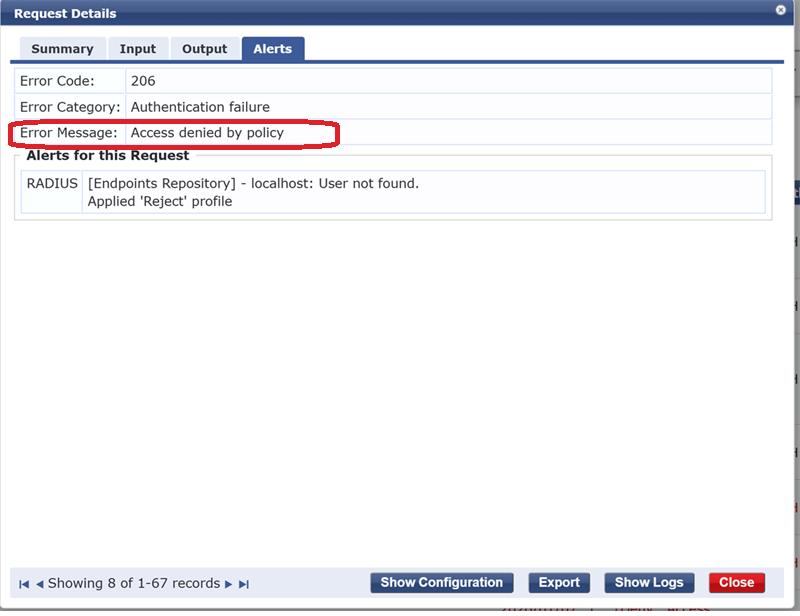 You can recognize this by the message in the Alert section in Access Tracker – "Access denied by policy." No condition in enforcement is being met, and the server is using the default policy [Deny Access Profile].