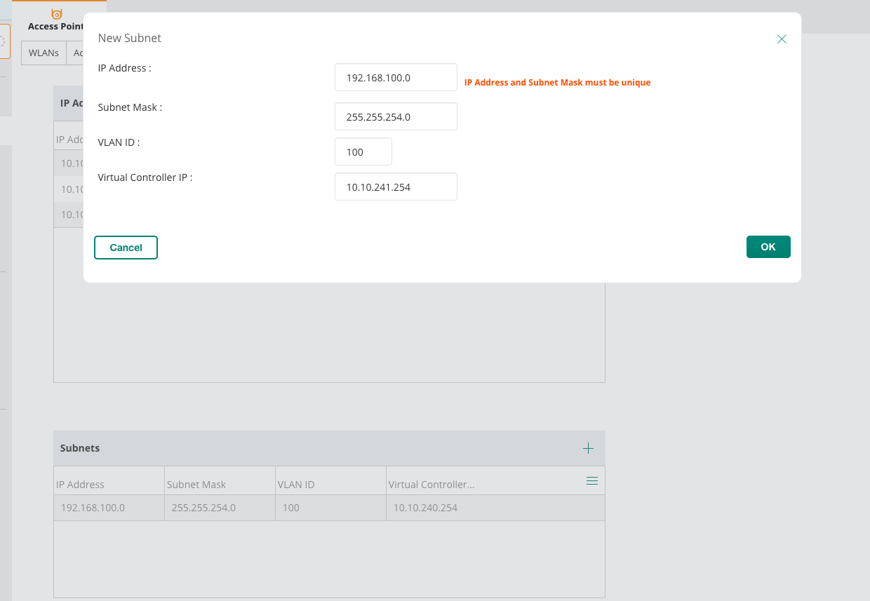 I can add the subnet with the first VC, when trying to add the subnet with the 2nd VC I get the error "IP Address and Subnet Mask must be unique".
