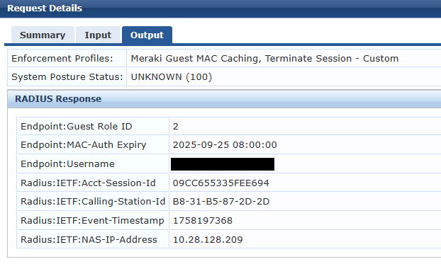 2025-09-18 08:09:28,348 [RequestHandler-1-0x7ff6453e9700 h=345 c=W00000001-01-68cbf677] DEBUG Core.PETaskRadiusCoAEnfProfileBuilder - sendRadiusCoAResponse: Sending CoAEnfRequest={"content":{"cnc_actions":{"display_name":"Terminate Session - Custom","id":1,"name":"Meraki-Terminate-Session","params":{"name":"Calling-Station-Id","value":"B8-31-B5-87-2D-2D"},{"name":"Acct-Session-Id","value":"09CC655335FEE694"},{"name":"Event-Timestamp","value":"1758197368"},{"name":"NAS-IP-Address","value":"10.28.128.209"}],"type":"RADIUS"}],"mac_address":"b831b5872d2d"},"id":"R00000000-01-68cbf653","name":"cnc_request"}