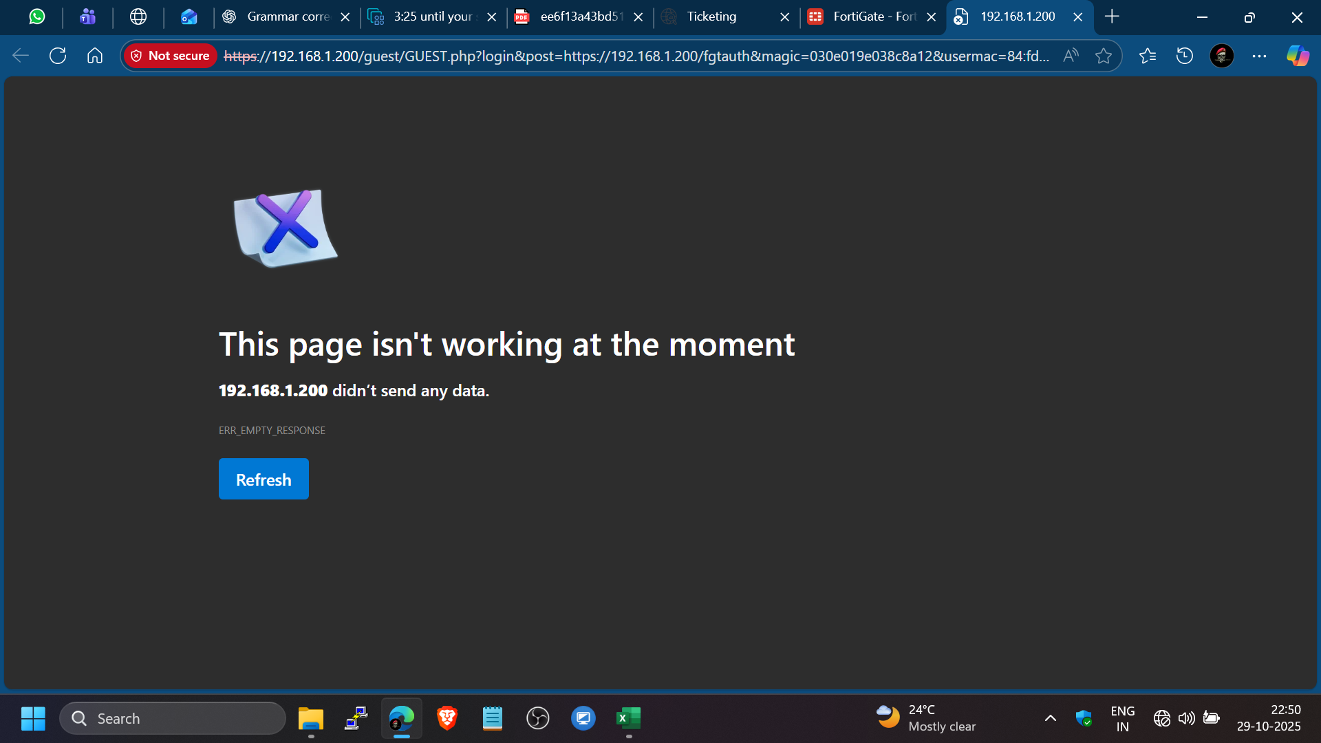 The FortiAP Guest Portal is currently not working - the page is showing an error.