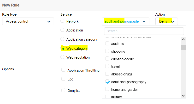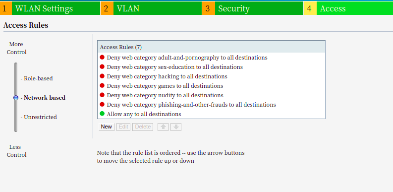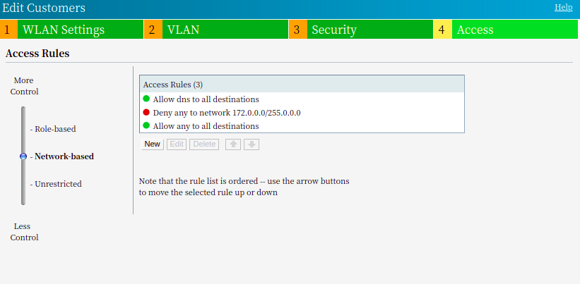 The rules you need will be unique to your scenario, but they may look something like this. Access to the network range 10.0.0.0/8 is denied but everything else is allowed. The order of the access rules are the order in which they are applied.
