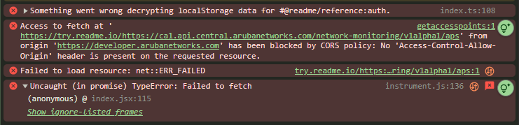 Use token on ca1.api.central…-> no response code, the "Try It!" button turns into a spinner and never changes back. When I check the Javascript console, I see a CORS policy error: