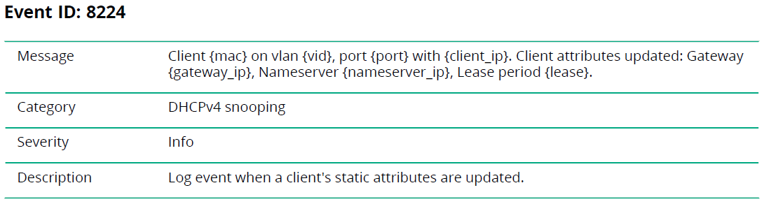2025-09-23T19:25:07.883487+0000 ipsavd[4407] <INFO> Event|8224|LOG_INFO|CDTR|1|Client 48:ba:4e:8b:ae:94 on vlan 1, port 1/1/1 with 16.1.1.98. Client attributes updated: Gateway 16.1.1.1, Nameserver 16.1.1.1, Lease period 864000.