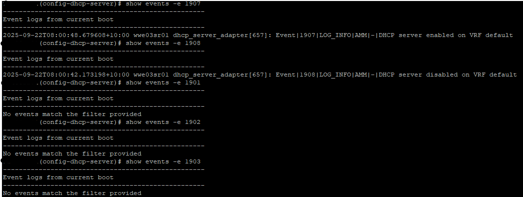 If I run the cmd "show dhcp-server leases" I am seeing the expected leases but when I run the show events -e {event id} cmd I am not seeing any events for the leases.