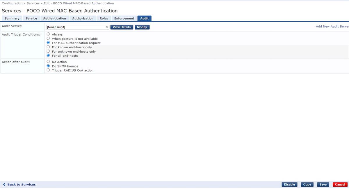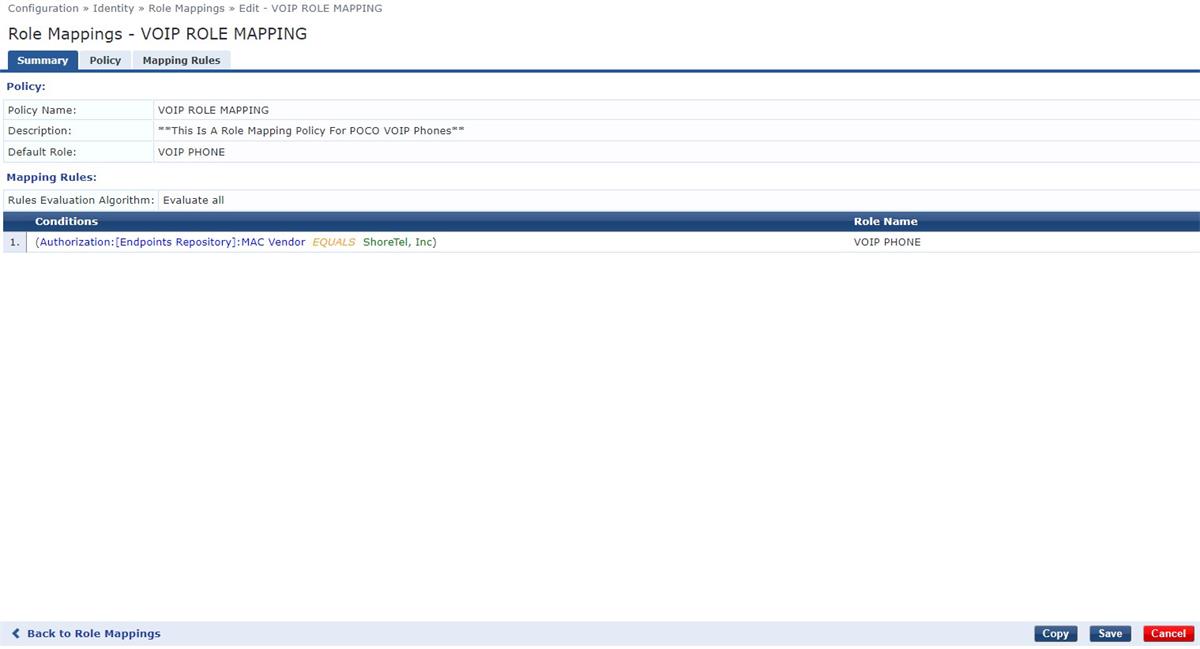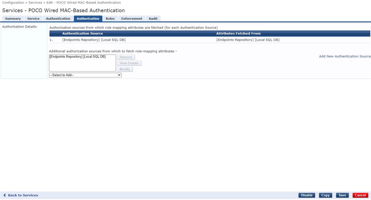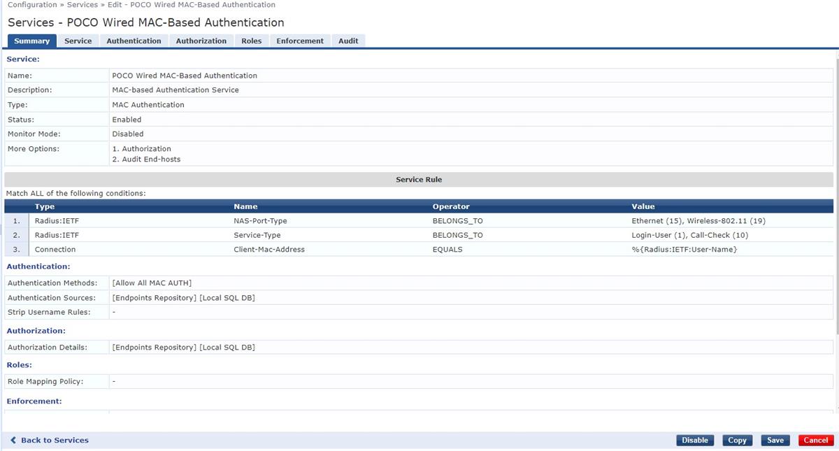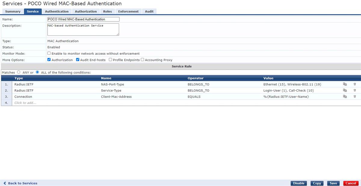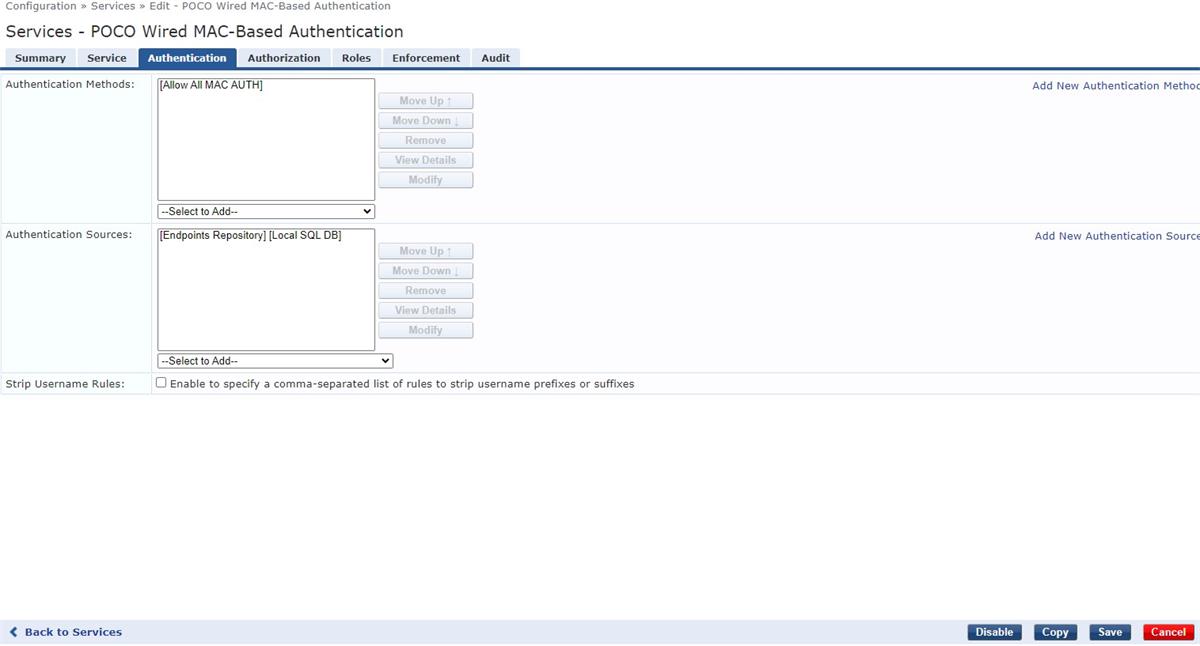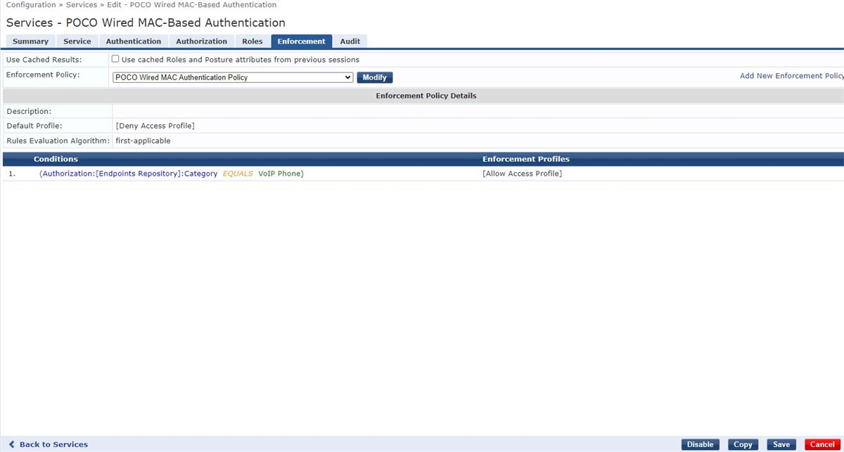Hello, I am in the process of configuring a MAB Service for our VOIP phones, but am not sure where the issue lies, as I don't show any ACCEPT or REJECT requests once the phone is plugged into one of the switchports that is configured for MAB. Here is my configuration within ClearPass.