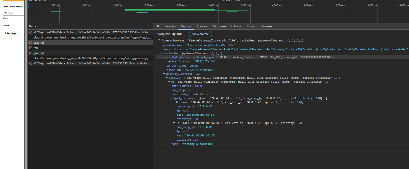 If I configured the profile from the GUI under Device Group → Group → Device Function: Mobility Gateway → HA → Gateway Clustering, and then tried the POST using the same Gateway Clustering profile name. In this case, the call passes validation but returns an error saying it cannot create a duplicate configuration. (which is expected, of course)
