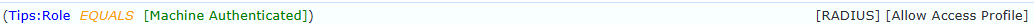During this MAC authentication ClearPass can now utilize the roles from the previous successful machine authentication and grant access based on that role. By default the [Machine Authenticated] role is cached for 24 hours. The MAC authentication service must have the authentication method [Allow All MAC AUTH] for this to work, or the MAC address must be marked as Known for the [MAC AUTH] method to work.