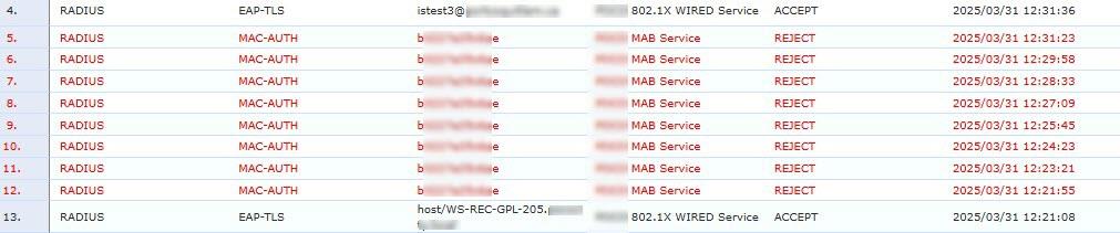 - During the time the you see the Rejects the client is able to retrieve a certificate for the user, maybe through the WLAN or you have a last resort VLAN configured in the switch for unauthenticated clients