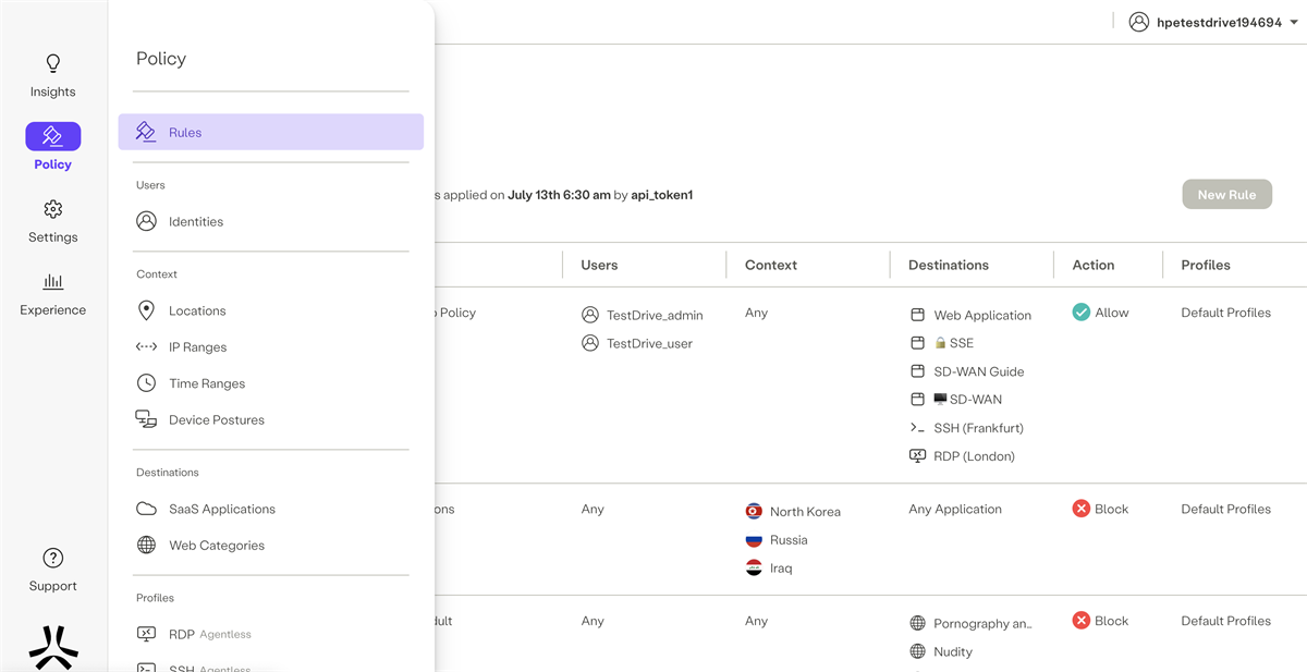 SSEでは、Axis Security の後発ベンダーならではの、単一ダッシュボードでのシンプルな管理が特徴です。SWG, CASB, ZTNA, DEM をシンプルな管理コンソールで簡単に設定・管理することができます。
