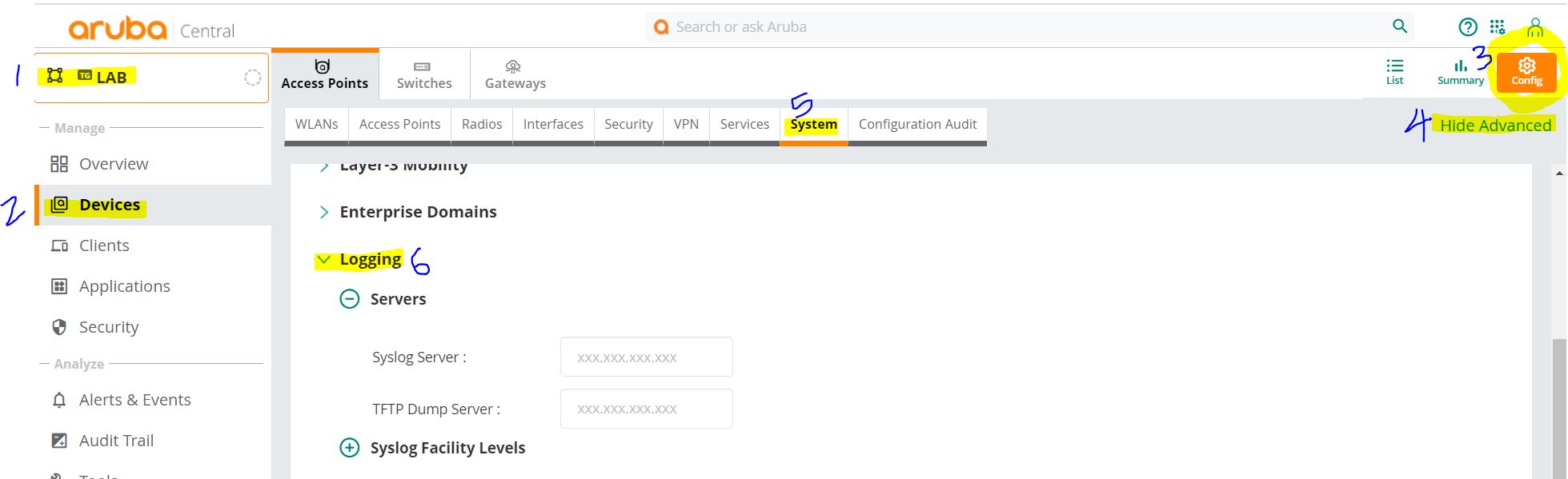 Where I can I setup the info for a syslog server? I've seen some documentation that says to use the logging command in the CLI, but that command doesn't seem to be available in my switches and I can't find it in AC either.