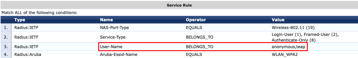 In this example, this service is triggered if the anonymous identitity is 'anonymous' or 'teap'; if you use 'intune' or 'byod', or so as identity for your intune managed clients you can have a different service match for those clients.