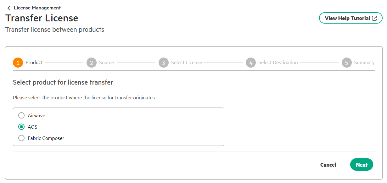 Follow the guided steps to transfer the license to another serial number. Both the old serial number and the license must be registered in the support portal. The new serial number is entered manually.